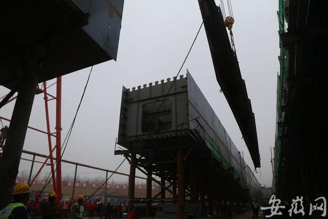 由于引江濟淮工程與G312合六葉公路相交,需新建一座公路橋跨越江淮運河。記者在現(xiàn)場看到,大橋雛形已現(xiàn),工人們正在緊張施工?!癎312合六葉公路橋全長280米,總用鋼量達1.6萬噸,橋面總寬52.5米,最大跨度達180米、采用鋼箱梁結構,在同類鋼箱梁中主跨跨度居全國第二、安徽省第一。”中鐵五局引江濟淮項目負責人羅偉平介紹,鋼箱梁由四幅連續(xù)梁組成,每幅鋼箱梁采用100米+180米+100米的三跨結構組成,其中3#、4#連續(xù)梁已于2020年4月份實現(xiàn)合龍。