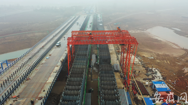 由于引江濟淮工程與G312合六葉公路相交,需新建一座公路橋跨越江淮運河。記者在現(xiàn)場看到,大橋雛形已現(xiàn),工人們正在緊張施工。“G312合六葉公路橋全長280米,總用鋼量達1.6萬噸,橋面總寬52.5米,最大跨度達180米、采用鋼箱梁結構,在同類鋼箱梁中主跨跨度居全國第二、安徽省第一。”中鐵五局引江濟淮項目負責人羅偉平介紹,鋼箱梁由四幅連續(xù)梁組成,每幅鋼箱梁采用100米+180米+100米的三跨結構組成,其中3#、4#連續(xù)梁已于2020年4月份實現(xiàn)合龍。