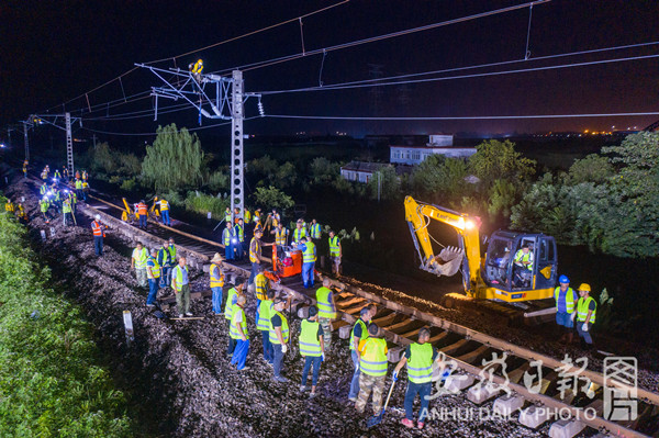 7月29日晚10:20分,寧西鐵路安徽段200余名工作人員隨著施工命令的下達,寧西上行線線路回?fù)苁┕ふ介_始,鋸軌、扒砟、穿滑軌撥移、起道搗固等一系列工序緊張有序展開。