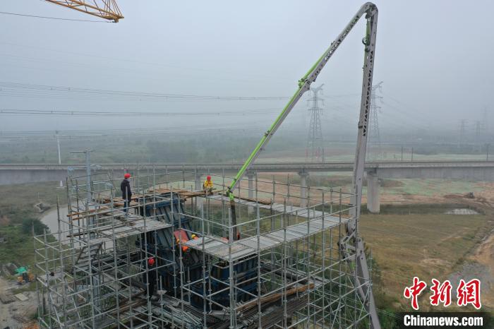 在引江濟淮工程江淮溝通段玉蘭大道橋主塔封頂施工現(xiàn)場,工作人員正在緊張而有序地施工。 韓翔 攝