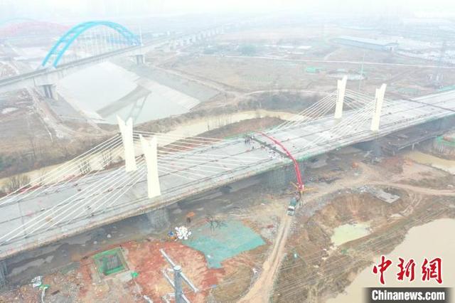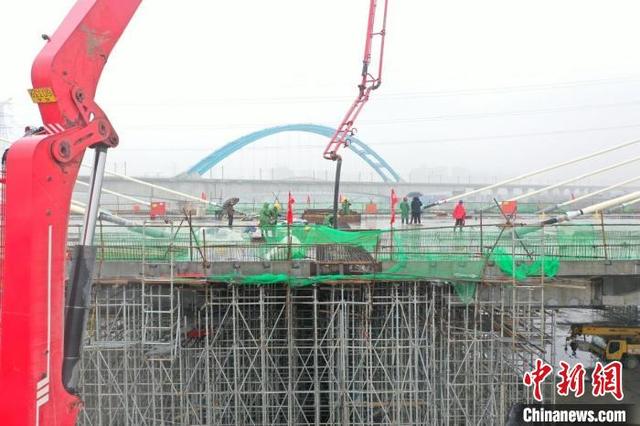施工人員正在為玉蘭大道橋合龍點(diǎn)澆筑混凝土。