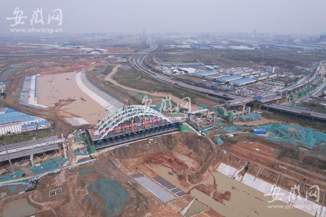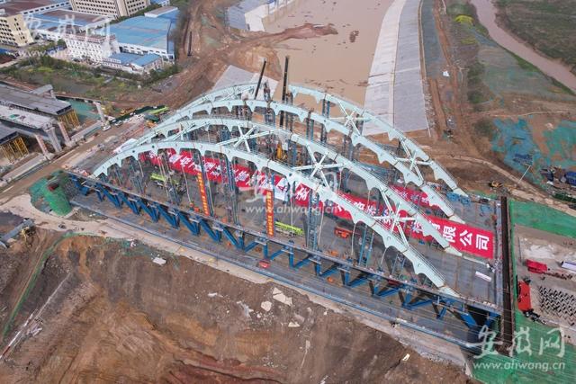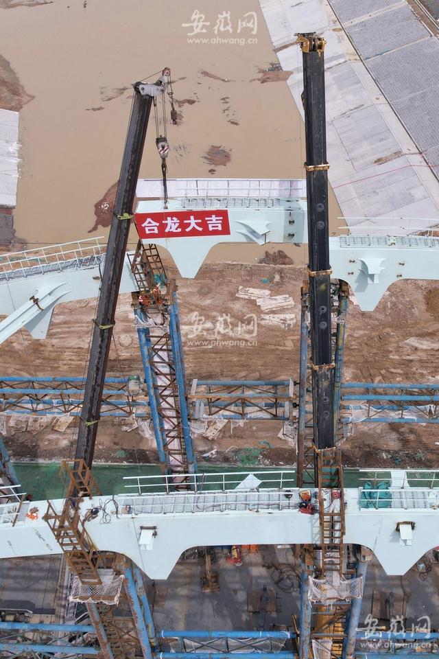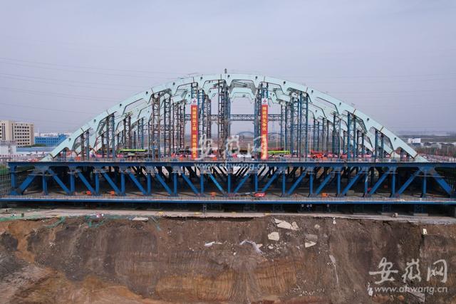 3月27日上午10點多,新安晚報、安徽網(wǎng)、大皖新聞記者在引江濟淮繁華大道橋工程現(xiàn)場看到,主橋拱肋經(jīng)過吊裝、固定、焊接等流程后,完成了合龍段的施工。