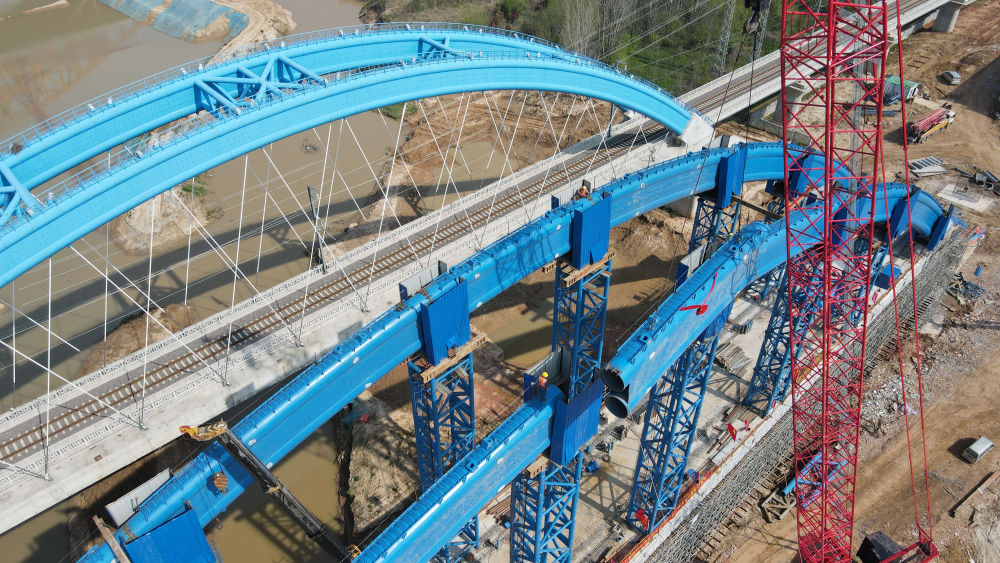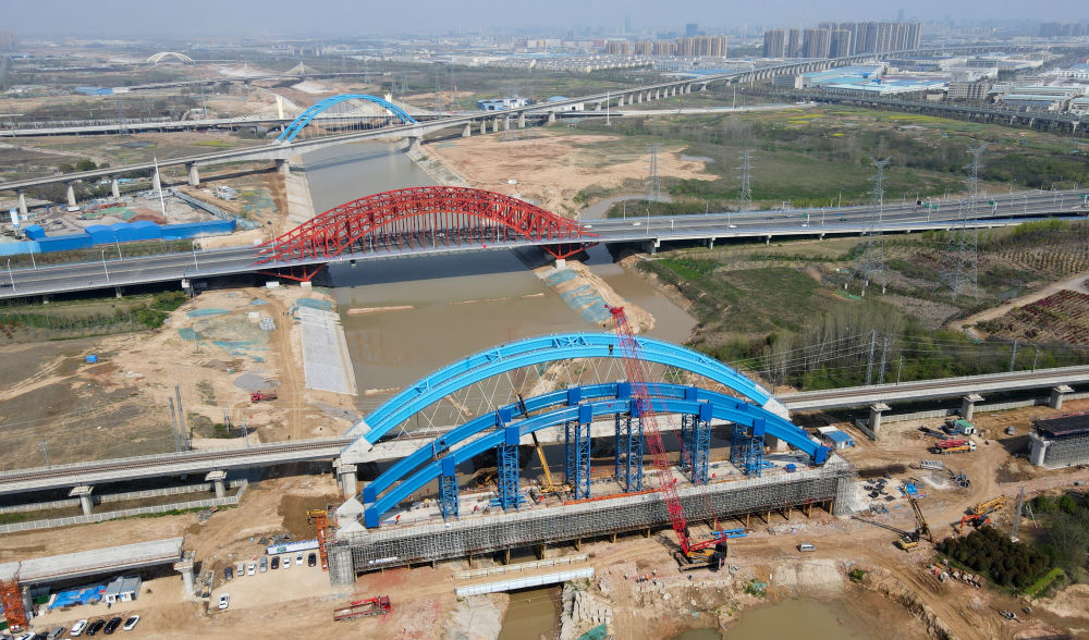 ↑這是中鐵四局引江濟(jì)淮合九鐵路改建工程特大橋系桿拱合龍施工現(xiàn)場(chǎng)(4月2日攝)。新華社記者 劉軍喜 攝影報(bào)道