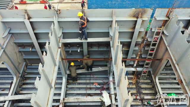 由于引江濟淮工程與G312合六葉公路相交,需新建一座公路橋跨越江淮運河。記者在現(xiàn)場看到,大橋雛形已現(xiàn),工人們正在緊張施工。“G312合六葉公路橋全長280米,總用鋼量達1.6萬噸,橋面總寬52.5米,最大跨度達180米、采用鋼箱梁結構,在同類鋼箱梁中主跨跨度居全國第二、安徽省第一。”中鐵五局引江濟淮項目負責人羅偉平介紹,鋼箱梁由四幅連續(xù)梁組成,每幅鋼箱梁采用100米+180米+100米的三跨結構組成,其中3#、4#連續(xù)梁已于2020年4月份實現(xiàn)合龍。